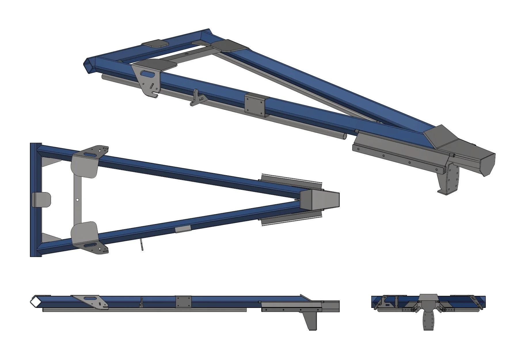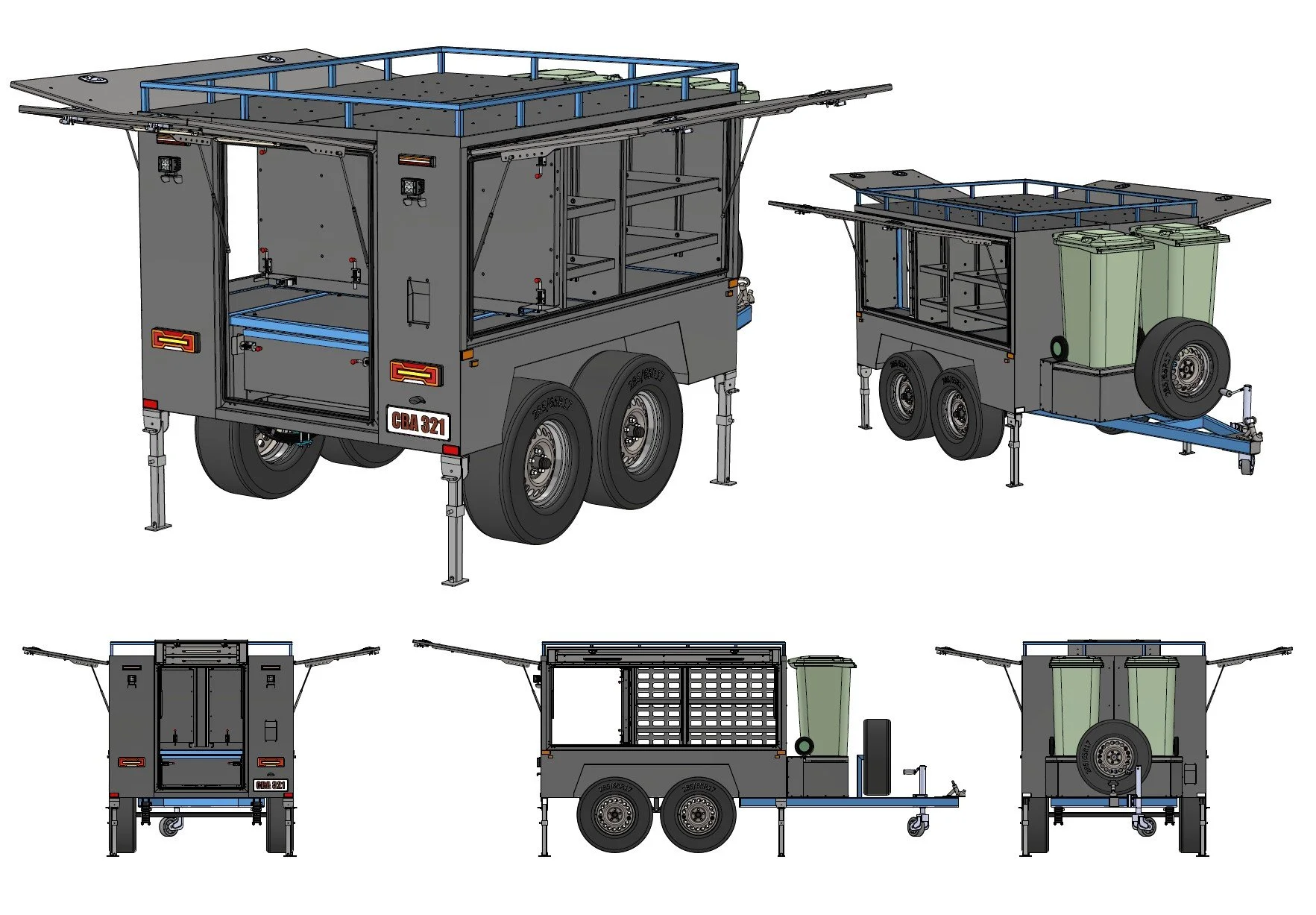 Three gullwing access doors with gas struts and lockable whale-tail handles provide weather-sealed access to the interior, while integrated LED lighting, dual batteries, Anderson plugs (front and rear), and a 12V power box support equipment charging and operation in the field. A drawbar-mounted aluminium toolbox provides additional storage without exceeding trailer roof height.